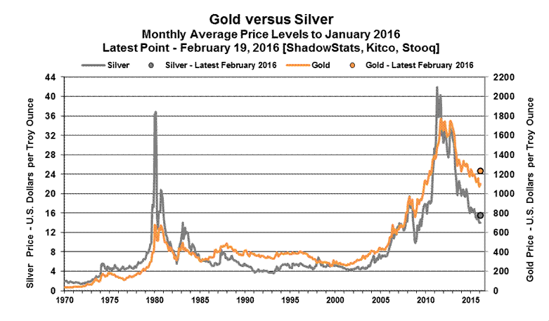 In like manner, the all-time high nominal price for silver in January 1980 of $49.45 per troy ounce (London afternoon fix, per silverinstitute.org)—although approached in 2011—still has not been hit since 1980, including in terms of inflation-adjusted dollars. Based on January 2016 CPI-U inflation, the 1980 silver-price peak would be $151 per troy ounce and would be $723 per troy ounce in terms of January 2016 ShadowStats-Alternate-CPI (1980-Base) adjusted dollars (again, all series not seasonally adjusted).