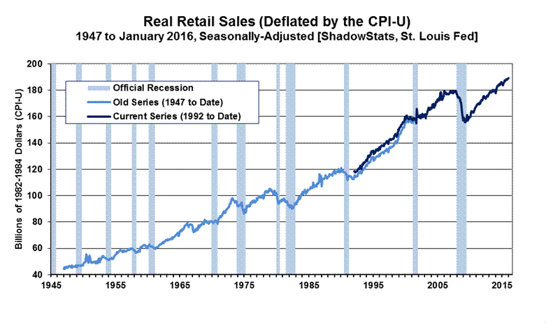 Based solely on the headline detail for January 2016, first-quarter 2016 real retail sales is on an early track for an annualized quarterly gain of 1.57%. Adjusted for realistic inflation (see Graph 2 in the Opening Comments, Commentary No. 783 and No. 777 Year-End Special Commentary), however, real retail sales and the broad economy never truly recovered from the economic collapse into 2008 and 2009.