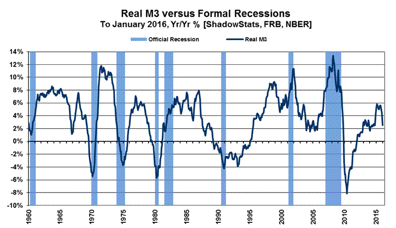 Real (Inflation-Adjusted) Money Supply M3—January 2016—Intensifying Plunge in Annual Growth. The signal for a double-dip, multiple-dip or simply protracted, ongoing recession, based on annual contraction in the real (inflation-adjusted) broad money supply (M3), remains in place and rapidly is deepening anew, despite real annual M3 growth having rallied in positive territory for several years. As shown in the accompanying graph—based on January 2016 CPI-U reporting and the latest ShadowStats-Ongoing M3 Estimate (including annual Federal Reserve Board money supply revisions)—annual inflation-adjusted growth in January 2016 M3 slowed to 2.6%, its lowest level since September 2014, from revised a 3.5% [previously 3.8%] in December 2015. The decline in the monthly rate of year-to-year change reflected both an increase in annual CPI-U inflation (contributing about 0.6% to the monthly decline) and a continuing decline in annual M3 growth (contributing about 0.4% to the monthly decline, see Commentary No. 784).