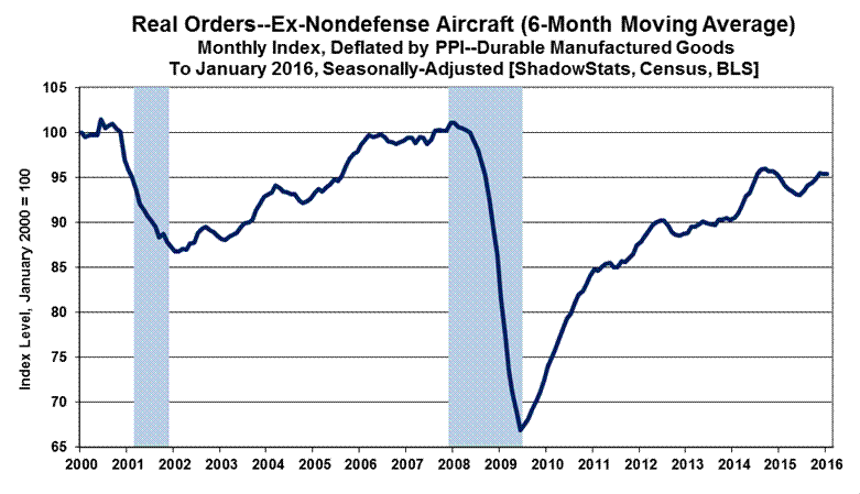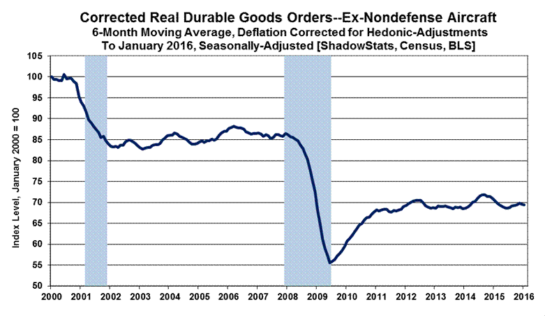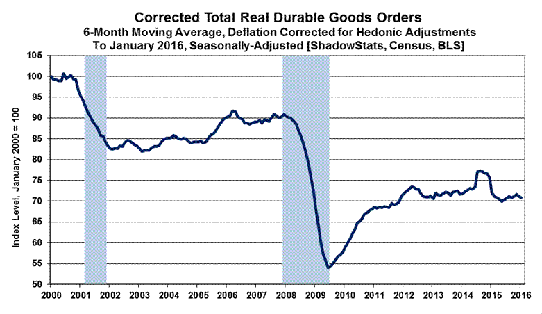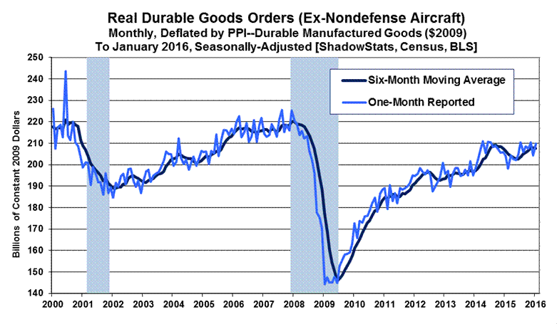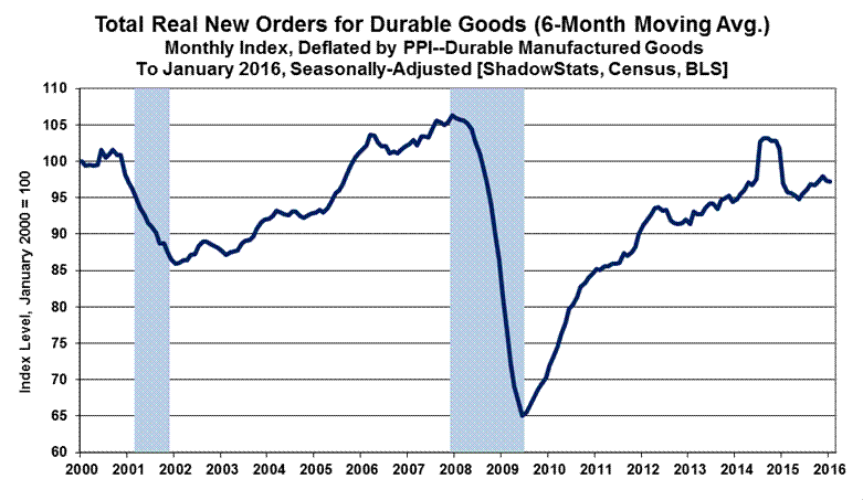 Real (Inflation-Adjusted) Durable Goods Orders—January 2016. ShadowStats uses the PPI component inflation measure “Durable Manufactured Goods” for deflating the new orders for durable goods series (as described and detailed in the Reporting Detail).