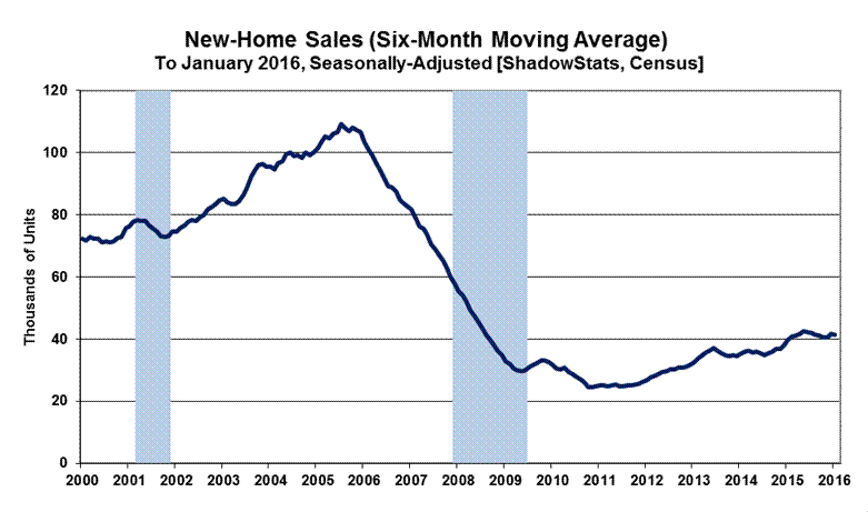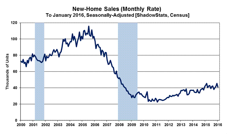 In the arena of continued extreme volatility and unstable, nonsensical headline reporting, consider that the annualized quarterly pace of sales gain in first-quarter 2015 was 43.9%, with the second-quarter 2015 sales activity in an annualized quarterly decline of 14.8% (-14.8%). Third-quarter 2015 new-home sales showed an unrevised annualized contraction of 6.8% (-6.8%), with the fourth-quarter sales gain estimated at 18.4% [previously up by 15.3%], with first-quarter 2016 activity down at an annualized quarterly pace of 11.3% (-11.3%), based solely on January 2016 reporting.