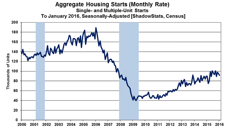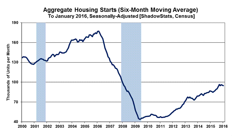 Ongoing Lack of Recovery from Collapse into 2009. Existing-Home Sales in January 2016 were down by a headline 24.8% (-24.8%) from the June 2005 pre-recession peak, a high that has not been matched since the collapse. In contrast, the January 2016 headline monthly Housing Starts remained down by 51.6% (-51.6%) versus its January 2006 pre-recession high.