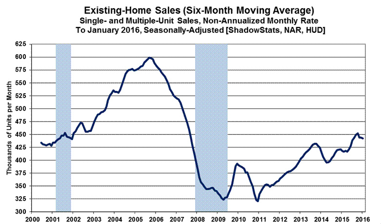 New- and Existing-Home Sales—January 2016—Low-Level Stagnation, Never Recovered, Unstable Reporting. January 2016 New- and Existing-Home Sales series both remained deep in depression (see Commentary No. 754), down respectively by 64% (-64%) and by 25% (-25%) from their pre-recession peaks. Holding in low-level stagnation, with statistically-insignificant changes in headline activity for New-Home Sales, smoothed activity has been turning lower (Graph 9) in the latter part of 2015 into 2016. Despite unstable and revised headline detail in Existing-Home Sales, and in the context of shifting patterns in the smoothed pattern of low-level stagnation, the pattern of smoothed Existing-Home Sales activity also has turned to the downside (Graph 13) in the latter part of 2015 into 2016. These series never recovered from the economic collapse into 2009. After going through a period of protracted, low-level stagnation, general housing construction and sales activity have begun to turn down anew.