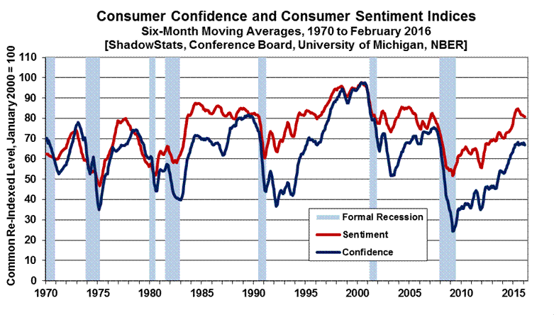 Consumer Conditions Update: Tumbling February Consumer Confidence. A full update of consumer liquidity conditions will follow in the employment/unemployment Commentary No. 790, of March 4th. That should include updated material on monthly median household income. Sentier Research advises that it has scheduled release of the headline December 2015 detail for the series on February 29th, with the January 2016 detail and annual benchmarking following thereafter.