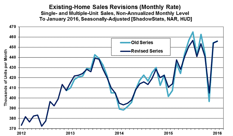 Headline Detail for January 2016 Existing-Home Sales. In the context of annual revisions and likely distortions, the February 23rd release of January 2016 existing-home sales (counted based on actual closings, NAR) showed a seasonally-adjusted, headline monthly gain of 0.4%, following a revised, slower monthly gain of 12.1% [previously up by 14.5%] in December 2015, and a shallower contraction of 8.1% (-8.1%) [previously down by 10.5%] in November.