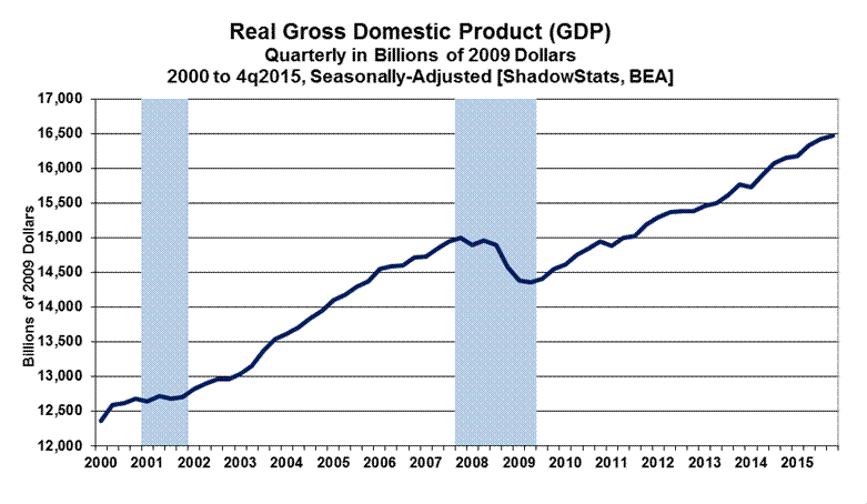 Underlying Economic Reality. The U.S. economy continues in an as-yet-unrecognized “new” recession, although headline monthly reporting activity generally has continued to move market expectations towards a “new” recession (the ShadowStats contention remains that the “new” downturn is in reality just a continuation of the economic crash into 2009). The third estimate of fourth-quarter 2015 GDP growth at 1.39%, versus the prior 1.01% and initial 0.69% guesses, however, was more-positive once again, versus market expectations that had been for no revision, and contrary to ShadowStats expectations for a downside revision. Nonetheless, the headline revisions and related current activity still were not statistically significant. An eventual fourth-quarter 2015 GDP contraction most likely now will come out of pending GDP benchmarking, discussed in the opening paragraphs of these Opening Comments. Separately, headline-monthly detail on first-quarter 2016 business activity already is trending negative, suggestive of a likely first-quarter 2016 GDP contraction.