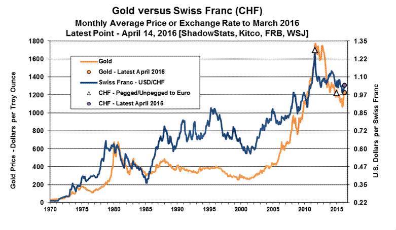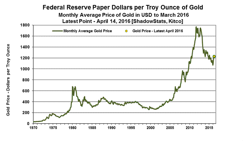 In like manner, the all-time high nominal price for silver in January 1980 of $49.45 per troy ounce (London afternoon fix, per silverinstitute.org)—although approached in 2011—still has not been hit since 1980, including in terms of inflation-adjusted dollars. Based on March 2016 CPI-U inflation, the 1980 silver-price peak would be $151 per troy ounce and would be $743 per troy ounce in terms of March 2016 ShadowStats-Alternate-CPI (1980-Base) adjusted dollars (again, all series not seasonally adjusted).