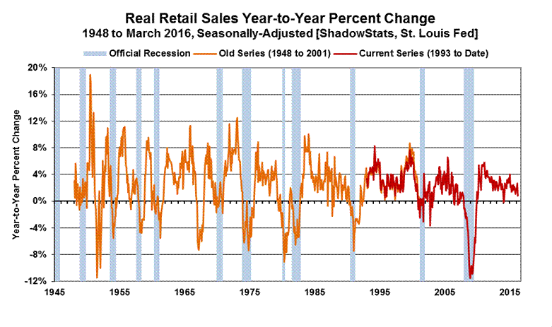 Real (Inflation-Adjusted) Retail Sales—March 2016—First-Quarter Contracted at Annualized Pace of 0.23% (-0.23%). Although the headline March 2016 CPI-U monthly gain came in a notch below the expected 0.2% increase, first-quarter 2016 retail sales contracted in both nominal and real terms, both before and after adjustment for inflation. The last time the series contracted quarterly was in first-quarter 2015, and again that contraction was both in nominal and real terms. Quarterly declines in real terms usually are seen in periods of recognized recession.