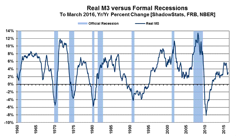 Real (Inflation-Adjusted) Money Supply M3—March 2016—Faltering Annual Growth. The signal for a double-dip, multiple-dip or simply protracted, ongoing recession, based on annual contraction in the real (inflation-adjusted) broad money supply (M3), remains in place, despite real annual M3 growth having rallied in positive territory for several years. As shown in the accompanying graph—based on March 2016 CPI-U reporting and the latest ShadowStats-Ongoing M3 Estimate (including annual Federal Reserve Board money supply revisions)—annual inflation-adjusted growth in March 2016 M3 moved higher, again, to 3.1%, up from an unrevised 2.6% in February 2016, which is tied with January 2016 as the lowest level since September 2014. The 0.5% gain in the monthly rate of year-to-year change reflected a 0.2% contribution from lower annual CPI-U inflation and a 0.3% gain in annual M3 growth (see Commentary No. 796).