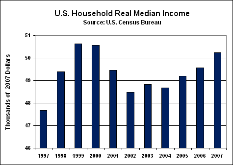 The Census Bureau’s Income, Poverty, and Health Insurance Coverage in the United States: 2007 was published in late August. I regularly ignore the heavily politicized reporting tied to poverty, because the highly theorized and massaged numbers have little relationship to or meaning in the real world. I do, however, look at the annual detail on reported income variance and income levels, which can be of significance. Some language and explanations here are repeated from prior annual analyses.